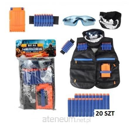 Wysokiej jakości zestaw wyposażenia sił specjalnych. Zawiera kamizelkę antyterrorysty z pasem na naboje (20 sztuk piankowych naboi), okulary taktyczne, komin z kościotrupem oraz magazynek.