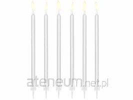 Świeczki urodzinowe gładkie w kolorze białym, wysokość ok. 14 cm. Zestaw zawiera 12 świeczek i podstawek.(1 op. / 12 szt.)