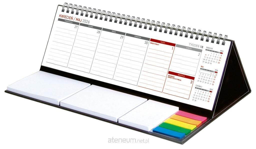 Wygodny kalendarz stojący na biurko z przejrzystym kalendarium w układzie tygodniowym z miejscem do notowania. Poręczne samoprzylepne karteczki. Kalendarium na spirali.
