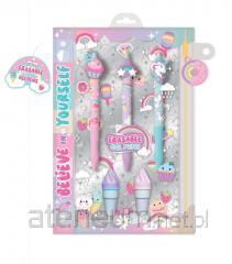 Zestaw zawiera: - gruby kołozeszyt w linie z ozdobnym gniotkiem na okładce - 4 spinacze z kolorowymi pomponami - długopis do przełączania 10 kolorów z ozdobną nakładką świecącą w ciemności - gniotek antystresowy - 3 zakreślacze - arkusz naklejek Zestaw zapakowany w ozdobne opakowanie prezentowe. Wiek: 5+