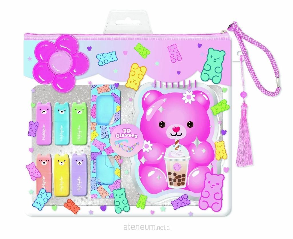 Zestaw zawiera: - kolorowanka na spirali z wydrukiem 3D widocznym po założeniu okularów - okulary z efektem 3D - 6 zakreślaczy Zestaw zapakowany w przezroczystą ozdobną saszetkę zamykaną na zamek.