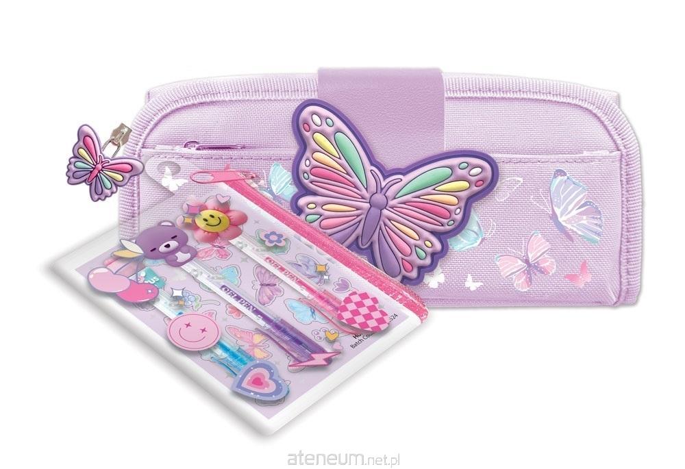 Rozkładany piórnik na przybory szkolne. Wiele przegródek i miejsca na drobiazgi, zamykany na rzep z ozdobą. Do piórnika dołączona jest przezroczysta saszetka zamykana na zamek z 3 mini długopisami żelowymi. Wiek: 5+