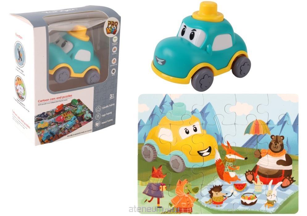 Zestaw przeznaczony dla dzieci od 3. roku życia, łączący funkcje zabawki manipulacyjnej oraz układanki edukacyjnej. Komplet składa się z plastikowego samochodziku w kolorze żółtym z turkusowym dachem oraz kartonowej układanki składającej się z 20 dużych elementów. Ilustracja przedstawia żółty pojazd w scenerii leśnej z postaciami zwierząt, co pobudza wyobraźnię dziecka i zachęca do opowiadania historii. Produkt wspiera rozwój zdolności manualnych, percepcji wzrokowej, koordynacji ręka-oko oraz rozpoznawania kształtów i relacji przestrzennych.