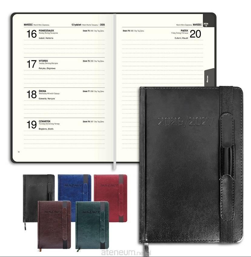 Perforowane narożniki umożliwiają szybkie odnalezienie bieżącej daty. Wewnątrz znajdziesz również tasiemkę do zaznaczania stron oraz strony dodatkowe na notatki, telefony kierunkowe, skorowidz alfabetyczny, imieniny i święta.