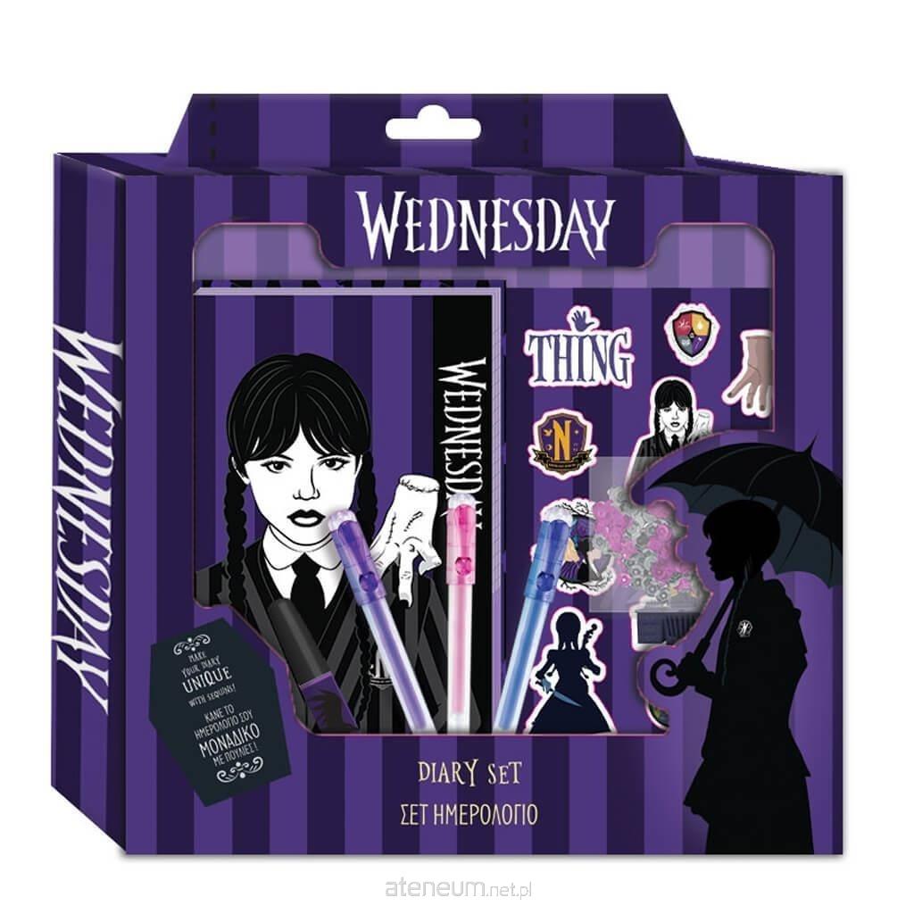 Zestaw zawiera: - pamiętnik 60 str. w linie - 3 długopisy - arkusz naklejek - pojemniczek z cekinami do ozdabiania - klej