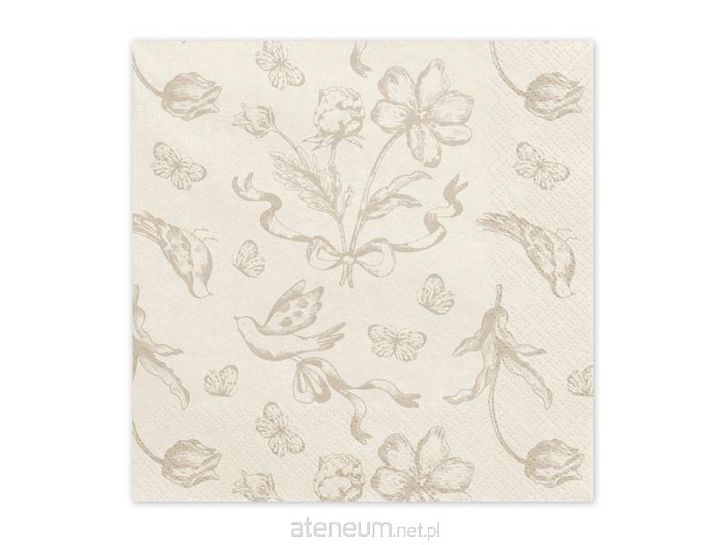 Papierowe serwetki w kolorze beżowym z ciemnobeżowymi kwiatami. Wymiary po rozłożeniu ok. 33 x 33 cm, wymiary po złożeniu ok. 16.5 x 16.5 cm.(1 op. / 12 szt.)