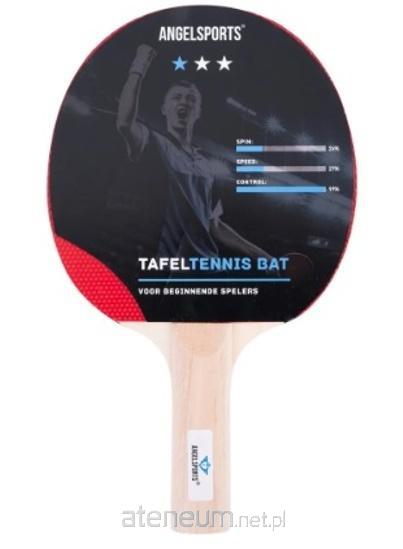 Rakietka do tenisa stołowego Angel Sports - 1 gwiazdka. Rakietka do tenisa stołowego ma prostą drewnianą rączkę i ma gumowe wypustki po obu stronach. Artykuł jest wykonany ze sklejki i jest zapakowany w przezroczyste opakowanie wiszące.