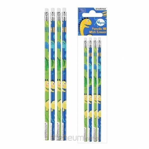 Ołówek nie łamie się podczas strugania, a gumka nie brudzi, ołówki to podstawowy produkt podczas nauki w szkole (rysowanie, matematyka, pisanie), łatwe w struganiu, nie łamią się, nie brudzą, uniwersalna twardość HB, każdy ołówek wyposażony w gumkę do mazania. Zestaw 4 ołówków z gumką z kolekcji STARPAK z grafiką w Dinozaury. Każdy ołówek zdobiony kolorową grafiką. Wykonany z trwałego drewna, zapewnia komfort rysowania i pisania. Służy nie tylko do rysowania i szkicowania, ale jest również niezbędny podczas lekcji matematyki, do nauki pisania, do robienia notatek na marginesach książek lub zeszytów. Dlatego tak ważna jest jego jakość. Dzięki wysokiej jakości grafit nie sypie się, nie brudzi i nie kruszy. Twardość HB sprawia, że ołówki STARPAK są uniwersalne i mogą być wykorzystywane zarówno do pisania, jak tez rysowania. Zapoznaj się również z innymi produktami STARPAK! Zawartość opakowania: 4 szt. ołówków z gumką. Wykonane z odpornego, nie łamiącego się podczas strugania grafitu. Wymiary/waga: wymiary produktu (dł.)[cm]: 19 cm, wymiary opakowania (wys. x szer. x gł.)[cm]: 25x5x1, waga produktu bez opakowania 1szt.[kg]: 0,01 kg, waga produktu w opakowaniu [kg]: 0,02 kg. Produkt przeznaczony dla dzieci w wieku: 3+. Ołówki pakowane w folijkę z zawieszką.