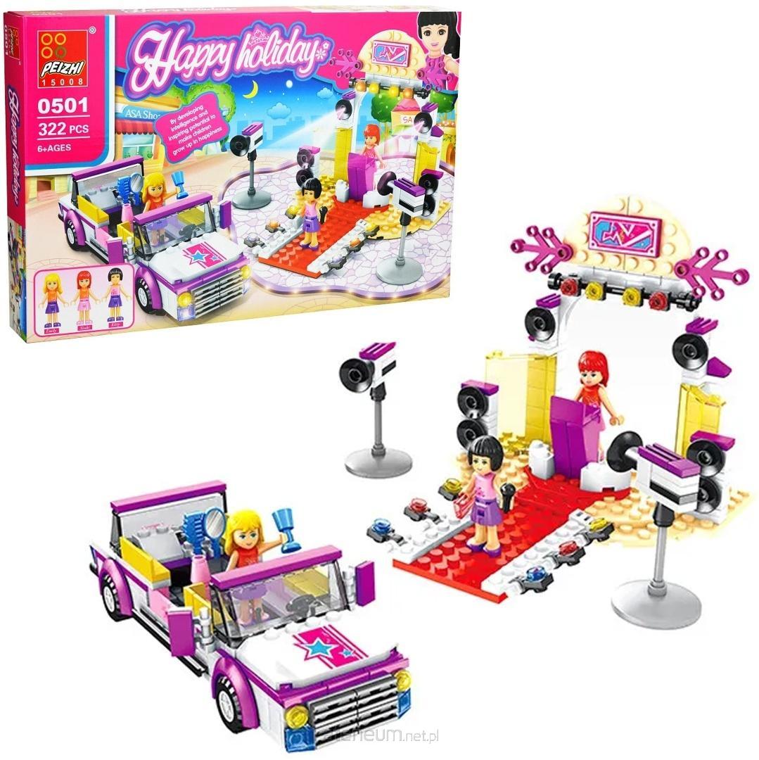 Zestaw Klocków Konstrukcyjnych "Happy Holiday" - Hollywoodzka Premiera / Gala (322 elementy) Wprowadź swoje dziecko w świat blichtru, sławy i czerwonego dywanu z zestawem klocków konstrukcyjnych "Happy Holiday"! Ten ekscytujący komplet pozwoli małemu konstruktorowi zbudować elegancki samochód cabrio oraz scenę z czerwonym dywanem, kamerami i oświetleniem, idealną do odgrywania gal, premier filmowych czy koncertów. Idealny dla dzieci, które uwielbiają kreatywne budowanie i odgrywanie ról z elementami mody i showbiznesu! Cechy produktu: Kompletny zestaw Glamour: Zawiera wszystkie elementy do zbudowania stylowego, białego cabrio z fioletowymi i różowymi detalami oraz efektownej sceny z czerwonym dywanem, bramą wejściową, reflektorami i kamerami. Figurki gwiazd: W zestawie znajdują się dwie urocze figurki (jedna z blond włosami, druga z czarnymi), gotowe do przejścia po czerwonym dywanie i odegrania swoich ról. Realistyczne detale: Elementy, takie jak reflektory, kamera, lusterko w samochodzie, a nawet imitacja nagród czy głośników, dodają zestawowi autentyczności i zachęcają do kreatywnej zabawy. Wysoka jakość klocków: Klocki są trwałe, dobrze spasowane i kompatybilne z innymi popularnymi markami klocków konstrukcyjnych, co pozwala na rozbudowę kolekcji i tworzenie własnych, unikalnych scenariuszy i wydarzeń. Rozwój umiejętności: Budowanie z klocków doskonale rozwija zdolności manualne, koordynację wzrokowo-ruchową, kreatywność, logiczne myślenie i wyobraźnię przestrzenną. Dzieci uczą się cierpliwości i precyzji, a także rozwijają umiejętności społeczne poprzez odgrywanie ról i tworzenie własnych historii. Ilość elementów: Zestaw składa się z 322 elementów, zapewniając ciekawe wyzwanie konstrukcyjne i wiele godzin kreatywnej zabawy. Wiek: Przeznaczony dla dzieci w wieku 6 lat i starszych (6+ AGES widoczne na opakowaniu), idealnie dopasowany do ich zdolności rozwojowych. Idealny na prezent: To fantastyczny pomysł na prezent na urodziny, święta czy inną okazję dla każdego małego miłośnika mody, gwiazd, klocków konstrukcyjnych i radosnej zabawy w odgrywanie ról. Wielkość opakowania: 40x27x5 cm Pozwól swojemu dziecku zorganizować własną galę i przeżywać niezapomniane chwile z zestawem "Happy Holiday"! To gwarancja emocjonującej i rozwijającej zabawy.