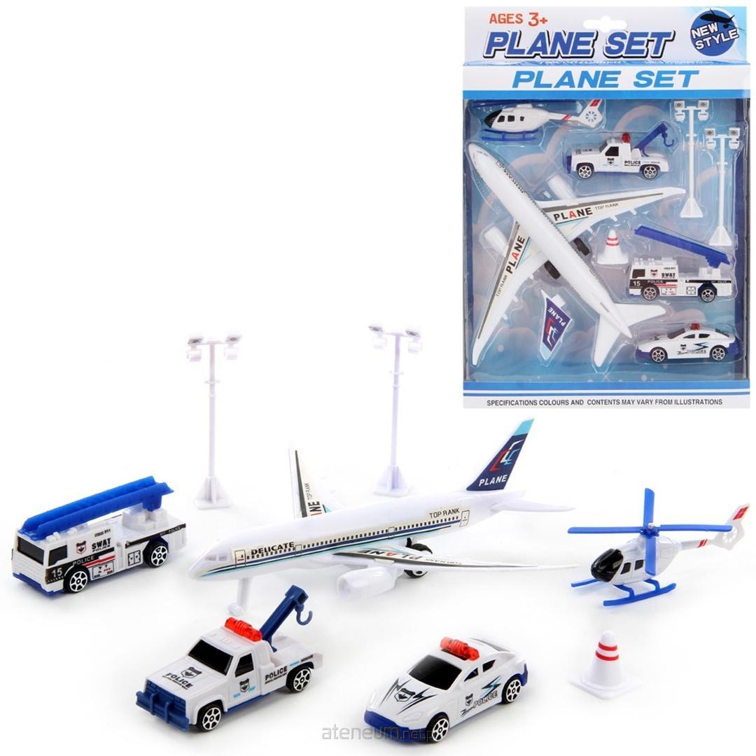 Zestaw Lotniskowy dla Dzieci - Lotnisko, Samolot i Pojazdy Służb Ratunkowych Opis produktu: Przenieś swoje dziecko w fascynujący świat lotniska dzięki temu wspaniałemu zestawowi! Idealny dla małych miłośników samolotów i pojazdów specjalnych, ten kompletny zestaw zapewni godziny kreatywnej zabawy i rozwinie wyobraźnię. Co zawiera zestaw? Duży, biały samolot pasażerski: Realistyczny model z detalami, gotowy do startu i lądowania na domowym lotnisku. Wóz strażacki z drabiną: Niezbędny do gaszenia pożarów i akcji ratunkowych. Radiowóz policyjny: Szybki i zwinny, dba o porządek i bezpieczeństwo. Samochód holowniczy/pomoc drogowa: Gotowy do niesienia pomocy w razie awarii. Helikopter: Do zadań specjalnych i obserwacji z lotu ptaka. Dwa słupy oświetleniowe: Dodają realizmu scenerii lotniska, oświetlając pas startowy lub drogę. Pachołek drogowy: Do wyznaczania stref bezpieczeństwa. Cechy produktu: Wysoka jakość wykonania: Elementy zestawu są solidne i wytrzymałe, zapewniając długą żywotność zabawki. Rozwój wyobraźni: Zestaw inspiruje do tworzenia własnych scenariuszy i ról, rozwijając kreatywność i umiejętności społeczne. Bezpieczeństwo: Produkt przeznaczony dla dzieci w wieku 3 lata+, co potwierdza opakowanie. Idealny na prezent: Zapakowany w estetyczne opakowanie, idealnie sprawdzi się jako upominek na urodziny, święta czy inne okazje. Szczegółowość: Każdy pojazd i samolot został zaprojektowany z dbałością o detale, co zwiększa realizm zabawy. Przeznaczenie: Ten zestaw to doskonała propozycja dla każdego dziecka, które marzy o zostaniu pilotem, policjantem, strażakiem czy po prostu uwielbia dynamiczną zabawę. Zapewnia mnóstwo frajdy podczas samodzielnej zabawy, jak i w grupie rówieśników. Wymiary opakowania: 26x21x4 cm Wiek: 3 lata +