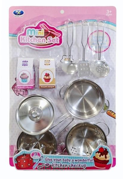 Zestaw kuchenny z metalowymi garnkami, pokrywkami i przyborami kuchennymi. Zapakowany na blistrze. Zabawka przeznaczona dla dzieci od lat 3. Podane wymiary stanowią wymiar opakowania.
