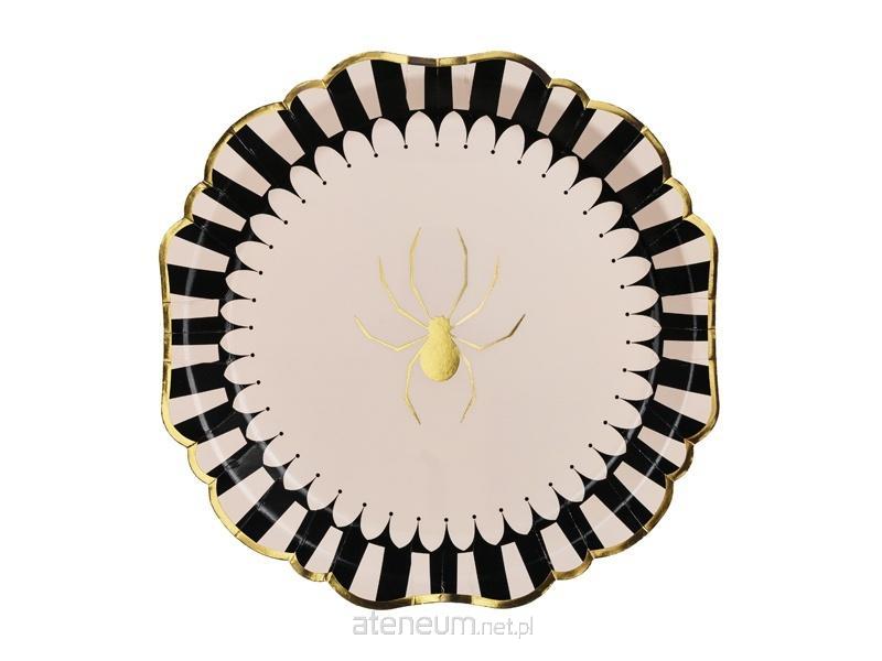 Papierowe talerzyki Halloween ze złotym, błyszczącym pająkiem. Średnica około 23 cm.(1 op. / 6 szt.)