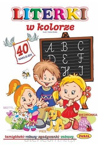 Książka edukacyjna. Ćwiczenia w pisaniu liter. Zadania logiczne - zgadywanki, rebusy, łamigłówki, s. 40, format A4, zestaw naklejek samoprzylepnych, broszura klejona.