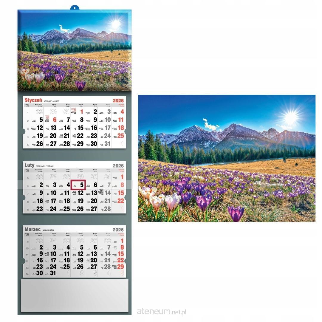 KALENDARZ TRÓJDZIELNY 2026 WYMIAR CAŁKOWITY KALENDARZA: 32 x 85,5cm GŁÓWKA KALENDARZA: Zdjęcie uszlachetniane folią błysk, z efektem wypukłości. KALENDARIUM: wym. 28,5 x 14 cm, trójjęzyczne (PL, GB, D), z numeracją tygodni i imieninami jest przytrzymywane przez kartonowe wypustki, które zapobiegają jego odstawaniu od plecków kalendarza. WYKOŃCZENIE: kartonowa zawieszka, pasek z czerwonym przesuwanym okienkiem, miejsce na notatki. WYMIAR ZDJĘCIA 32 x 22 cm ZDJĘCIE Z EFEKTEM WYPUKŁOŚCI: uszlachetnione folią błysk.