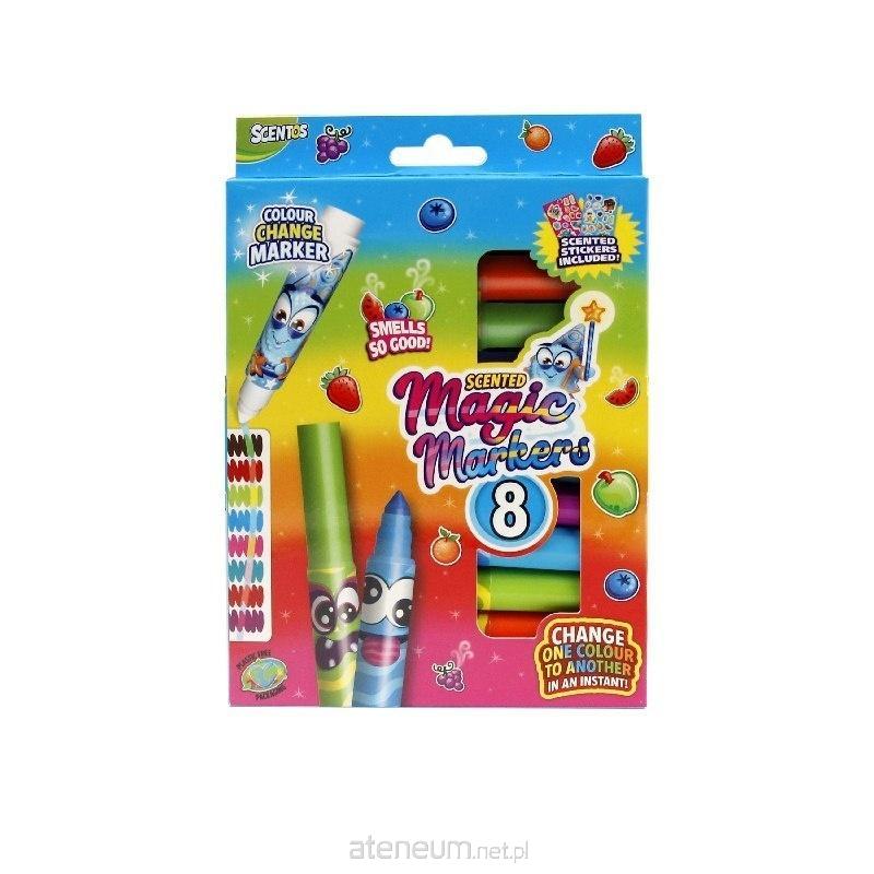 Zestaw pełen pachnących niespodzianek, który umili rysowanie i pisanie! Tworzy go osiem zapachowych markerów, ozdobionych zabawnymi buźkami. Siedem z nich to markery kolorowe, a ósmy, to marker magiczny, bezbarwny, którego zadaniem jest zmiana koloru pozostałych mazaczków. Dodatkowo, w zestawie znajdują się zapachowe naklejki, którymi ozdobić można zeszyt, pamiętnik lub inny przedmiot codziennego użytku.