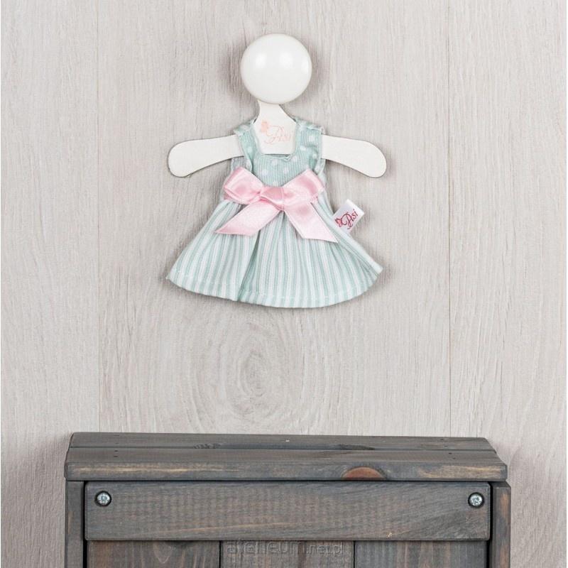 Urocza bawełniana sukieneczka w biało-miętowe paseczki i kropeczki została zaprojektowana specjalnie dla lalek hiszpańskich Bomboncin i Tom o wysokości 20 cm. Zachwyca lśniąca satynowa różowa wstążeczka zdobiąca talię. Wygodne zapięcie na rzep umożliwia łatwe zdjęcie i nałożenie ubranka. Outfit na kartonowym wieszaczku z logo marki ASI zapakowany jest w foliowe opakowanie. Uzupełnij kolekcję ubranek lalek hiszpańskich Bomboncin i uatrakcyjnij dziecku zabawę!