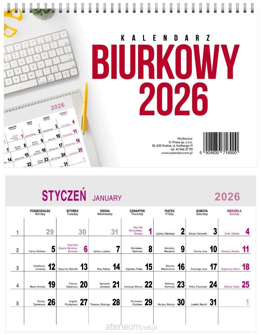 - Format 240 x 150 - Ilość stron: 13 - Oprawa: spirala - Układ kalendarium: 1 miesiąc na stronie - Zawiera czytelne kalendarium z imieninami i Świętami w języku polskim Kalendarz Biurkowy miesięczny to praktyczne i stylowe rozwiązanie zarówno do biura, jak i do domu. Dzięki kompaktowym wymiarom oraz przemyślanej konstrukcji doskonale komponuje się z każdą przestrzenią roboczą, dodając profesjonalnego charakteru Twojemu biurku. Wykonany z dbałością o detale, kalendarz posiada przejrzyste kalendarium, które ułatwia orientację w tygodniowych obowiązkach oraz planowanie z odpowiednim wyprzedzeniem. Spiralna oprawa nie tylko podkreśla elegancki wygląd, ale także zapewnia wygodę użytkowania - łatwe przewracanie stron oraz dostosowanie układu do własnych potrzeb. Każda strona oferuje dużą przestrzeń do notowania najważniejszych spotkań, zadań i przypomnień. Zaznaczone święta oraz daty imienin pomagają pamiętać o ważnych okazjach. To doskonałe narzędzie do organizacji czasu dla osób ceniących funkcjonalność i estetykę w codziennej pracy.