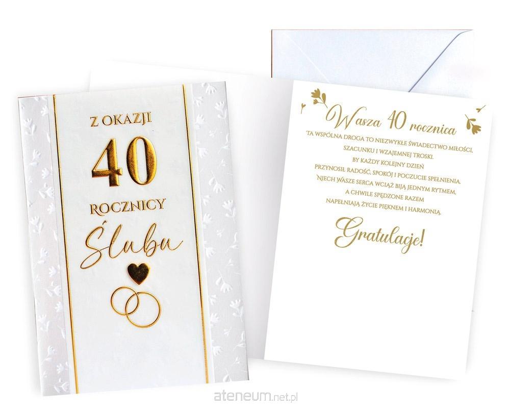 Kartka Dream Cards "Z okazji 40. rocznicy ślubu" DK-1341 Kartka B6 z ozdobnej serii Dream Cards - nieduża, ale robi wrażenie dzięki atrakcyjnej kolorystyce i ciekawym zdobieniom. To idealny wybór łączący przyjazną cenę z jakością. Cechy szczególne: wielkość: B6, 16.6 x 11.7 cm po złożeniu, koperta: w zestawie, kolorowa, zdobienia: kolorowe, różnorodne, bogate (w zależności od wzoru: przyklejane dekoracje, elementy biżuteryjne, odstawniki, metaliczne folie, tłoczenia itp.), okazja: Rocznica