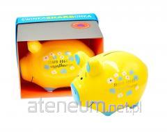 Skarbonka mała świnka SKM-006 "Stworzona, by wydawać, zmuszona, by oszczędzać" Ceramiczna skarbonka w kształcie świnki to świetny pomysł na prezent. Świnki są kolorowe i ozdobione zabawnymi tekstami, świetnie się sprawdzą jako dekoracja pokoju. Cechy szczególne: Typ produktu: skarbonka na prezent, Materiał: ceramika Wys. świnki: 8,5 cm. Waga: 214 g Wymiary pudełka: 12,5 x 10 x 10 cm (dł x szer x wys) Opakowanie: kolorowy kartonik Okazja: ogólne życzenia, urodziny