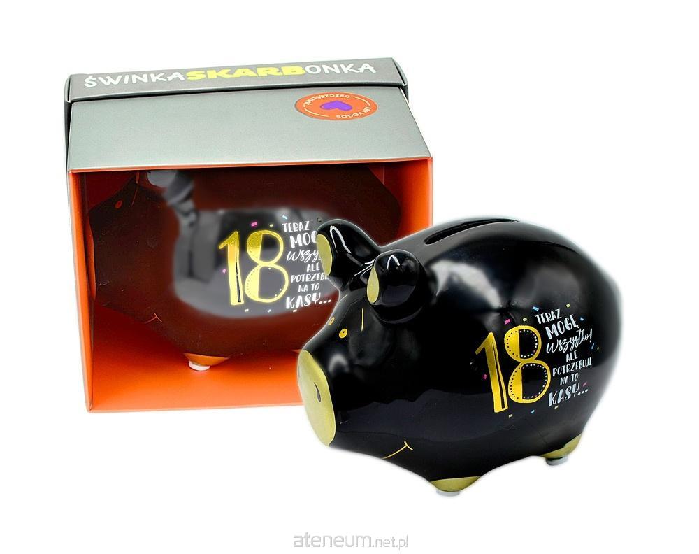 Skarbonka mała świnka SKM-010 "18, teraz mogę wszystko" Ceramiczna skarbonka w kształcie świnki to świetny pomysł na prezent. Świnki są kolorowe i ozdobione zabawnymi tekstami, świetnie się sprawdzą jako dekoracja pokoju. Cechy szczególne: Typ produktu: skarbonka na prezent, Materiał: ceramika Wys. świnki: 8,5 cm. Waga: 214 g Wymiary pudełka: 12,5 x 10 x 10 cm (dł x szer x wys) Opakowanie: kolorowy kartonik Okazja: osiemnastka