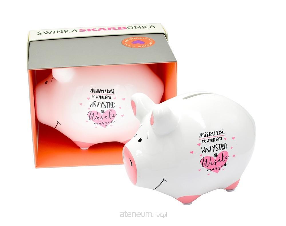 Skarbonka mała świnka SKM-015 "Zbieramy kasę, bo wydaliśmy wszystko na wesele" Ceramiczna skarbonka w kształcie świnki to świetny pomysł na prezent. Świnki są kolorowe i ozdobione zabawnymi tekstami, świetnie się sprawdzą jako dekoracja pokoju. Cechy szczególne: Typ produktu: skarbonka na prezent, Materiał: ceramika Wys. świnki: 8,5 cm. Waga: 214 g Wymiary pudełka: 12,5 x 10 x 10 cm (dł x szer x wys) Opakowanie: kolorowy kartonik Okazja: ogólne życzenia, urodziny