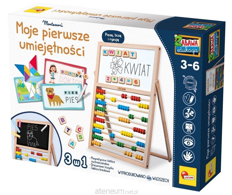 Dzięki edukacyjnym kartom, dwustronnej tablicy, małym magnetycznym literkom i specjalnemu zmywalnemu pisakowi, dziecko uczy się czytać i pisać wiele słów. Z drewnianym abakusem, dedykowanymi kartami i magnetycznymi cyframi, maluch łatwo nauczy się liczyć i wykonywać pierwsze obliczenia. Dodatkowo, dziecko może puścić wodze swojej wyobraźni, rysując na klasycznej tablicy kredą, a także rozwijać swoje zdolności logiczne, grając w kolorową grę Tangram.