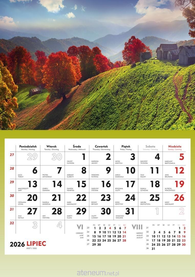 Główka pełnokolorowa, okienko przesuwane, nazwy miesięcy i tygodni w wersjach językowych, miejsce na nadruk reklamowy.