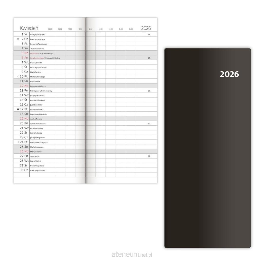 Kalendarz kieszonkowy na 2026 rok z miesięcznym kalendarium, z miejscem na notatki przy każdym dniu. Po otwarciu mamy widok na cały miesiąc - taki układ idealnie sprawdzi się do zapisywania godzin pracy, spotkań, wizyt - niezastąpiony jako podręczny grafik.