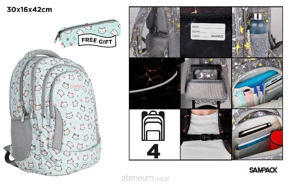 Plecak szaro-miętowy kotki czterokomorowy 30x16x42cm piórnik w zestawie