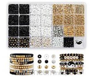 zestaw do robienia bransoletek, koraliki czarne, białe, złote i srebrne, aplikacje, literki, sznurki; Box