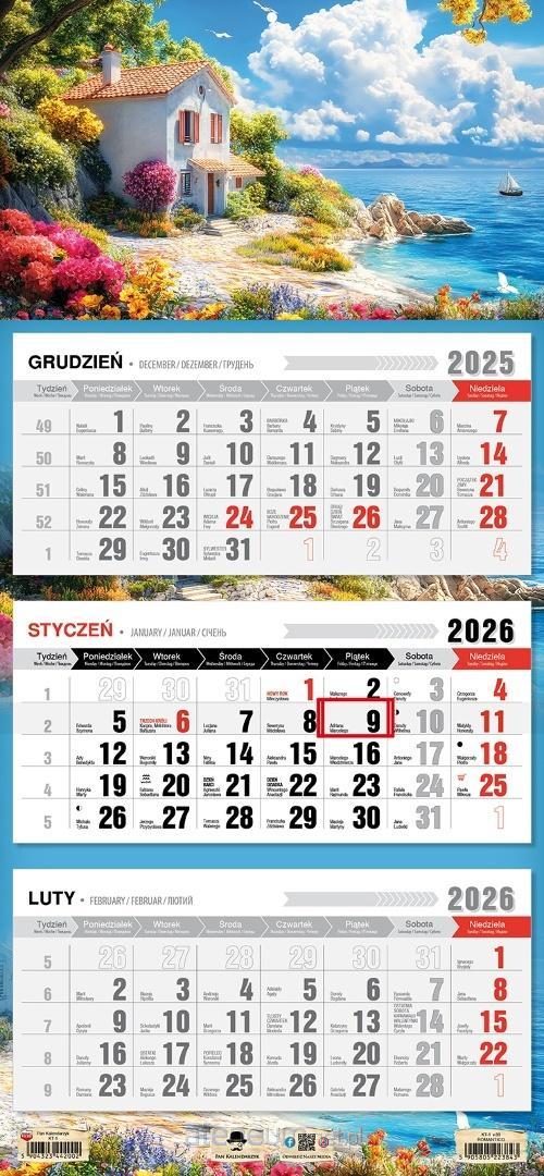 Kalendarz 2026 TRÓJDZIELNY PŁASKA GŁÓWKA. Format 315/680mm. Trzy komplety klasycznych kalendariów z przesuwnym okienkiem. Główka wypukła z otworem wierconym. Dodatkowo nazwy miesiąca i dni tygodnia w języku Ukraińskim, Angielskim i Niemieckim. Kalendarium dodatkowo zawiera fazy księżyca i znaki zodiaku. Dużo miejsca do notowania, czytelne duże litery i cyfry. Nowoczesne i klasyczne wzornictwo, dopracowane wzory, czytelne kalendarium. Praktyczny i elegancki kalendarz który sprawdzi się zarówno w domu, biurze jak i innych pomieszczeniach.