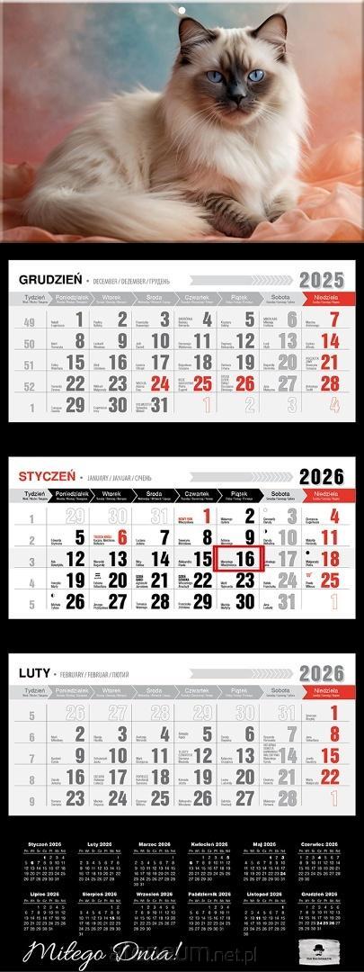 Kalendarz 2026 Trójdzielny PREMIUM Z WYPUKŁĄ GŁÓWKĄ. Format 315/810mm. Trzy komplety klasycznych kalendariów z przesuwnym okienkiem. Główka wypukła z otworem wierconym. Dodatkowo nazwy miesiąca i dni tygodnia w języku Ukraińskim, Angielskim i Niemieckim. Kalendarium dodatkowo zawiera fazy księżyca i znaki zodiaku. Dużo miejsca do notowania, czytelne duże litery i cyfry. DODATKOWO PRZEDŁUŻONE PLECKI KOLOREM DOPASOWANE DO WZORU ZE SKRÓCONYM KALENDARIUM NA ROK 2026. Nowoczesne i klasyczne wzornictwo, dopracowane wzory, czytelne kalendarium. Praktyczny i elegancki kalendarz który sprawdzi się zarówno w domu, biurze jak i innych pomieszczeniach.
