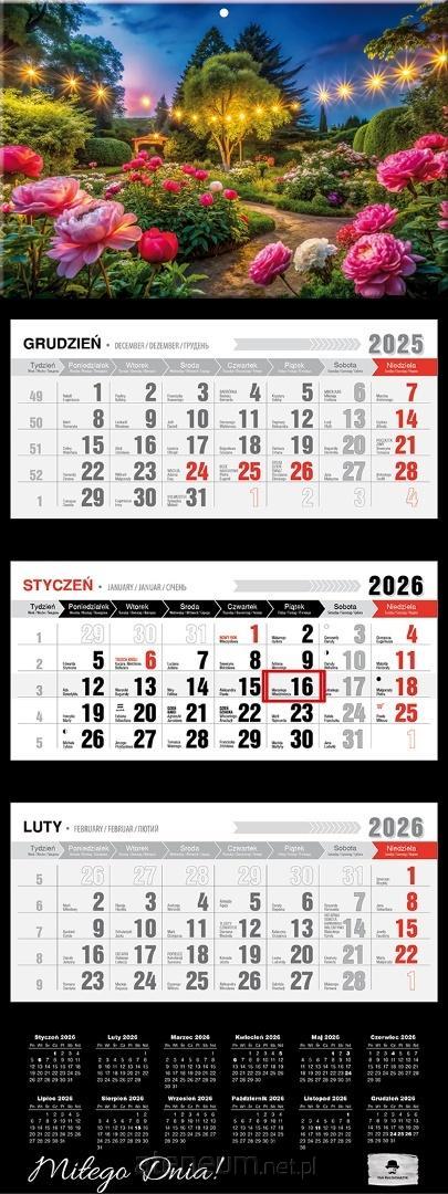 Kalendarz 2026 Trójdzielny PREMIUM Z WYPUKŁĄ GŁÓWKĄ. Format 315/810mm. Trzy komplety klasycznych kalendariów z przesuwnym okienkiem. Główka wypukła z otworem wierconym. Dodatkowo nazwy miesiąca i dni tygodnia w języku Ukraińskim, Angielskim i Niemieckim. Kalendarium dodatkowo zawiera fazy księżyca i znaki zodiaku. Dużo miejsca do notowania, czytelne duże litery i cyfry. DODATKOWO PRZEDŁUŻONE PLECKI KOLOREM DOPASOWANE DO WZORU ZE SKRÓCONYM KALENDARIUM NA ROK 2026. Nowoczesne i klasyczne wzornictwo, dopracowane wzory, czytelne kalendarium. Praktyczny i elegancki kalendarz który sprawdzi się zarówno w domu, biurze jak i innych pomieszczeniach.