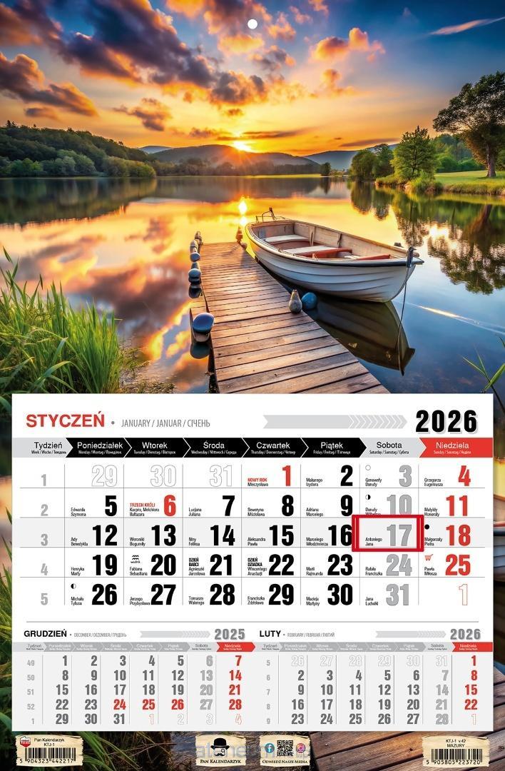 Kalendarz 2026 Trójdzielny JEDNODZIELNY. Format 315/480mm. Układ kalendariów jednodzielny z przesuwnym okienkiem. Główka z otworem wierconym. Dodatkowo nazwy miesiąca i dni tygodnia w języku Ukraińskim, Angielskim i Niemieckim. Kalendarium dodatkowo zawiera fazy księżyca i znaki zodiaku. Dużo miejsca do notowania, czytelne duże litery i cyfry.