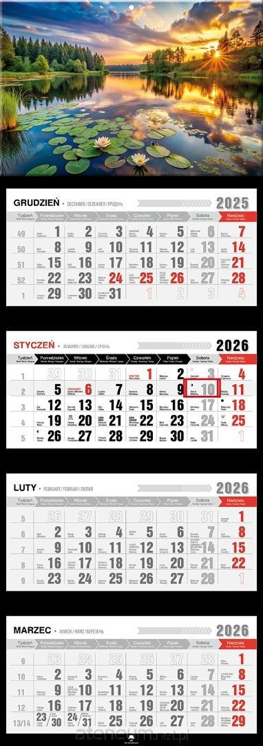 Kalendarz 2026 CZTERODZIELNY/ CZTEROMIESIĘCZNY /KWARTALNY PREMIUM Z WYPUKŁĄ GŁÓWKĄ. Format 315/890mm. Trzy komplety klasycznych kalendariów z przesuwnym okienkiem. Główka wypukła z otworem wierconym. Dodatkowo nazwy miesiąca i dni tygodnia w języku Ukraińskim, Angielskim i Niemieckim. Kalendarium dodatkowo zawiera fazy księżyca i znaki zodiaku. Dużo miejsca do notowania, czytelne duże litery i cyfry. Tematyka krajobrazy, pejzaże, zwierzęta, widoki, glamour, kawa. Nowoczesne i klasyczne wzornictwo, dopracowane wzory, czytelne kalendarium. Praktyczny i elegancki kalendarz który sprawdzi się zarówno w domu, biurze jak i innych pomieszczeniach.