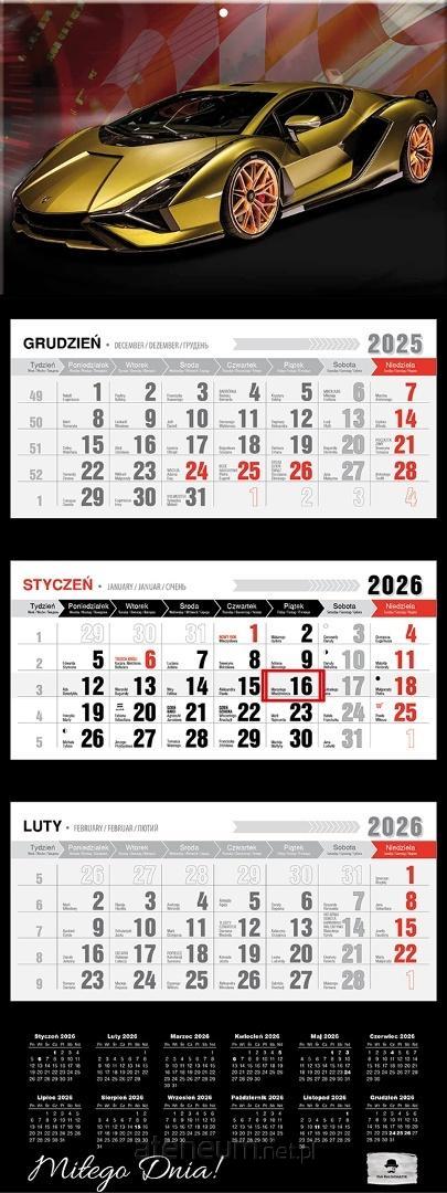 Kalendarz Trójdzielny PREMIUM Z WYPUKŁĄ GŁÓWKĄ. Format 315/810mm. Trzy komplety klasycznych kalendariów z przesuwnym okienkiem. Główka z otworem wierconym. Dodatkowo nazwy miesiąca i dni tygodnia w języku Ukraińskim, Angielskim i Niemieckim. Kalendarium dodatkowo zawiera fazy księżyca i znaki zodiaku. Dużo miejsca do notowania, czytelne duże litery i cyfry. DODATKOWO PRZEDŁUŻONE PLECKI KOLOREM DOPASOWANE DO WZORU ZE SKRÓCONYM KALENDARIUM NA ROK 2026.