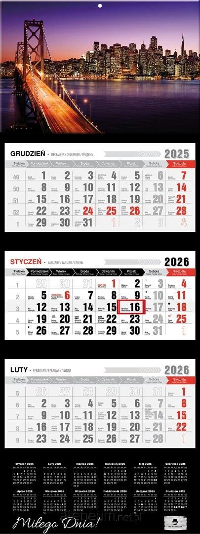 Kalendarz Trójdzielny PREMIUM Z WYPUKŁĄ GŁÓWKĄ. Format 315/810mm. Trzy komplety klasycznych kalendariów z przesuwnym okienkiem. Główka z otworem wierconym. Dodatkowo nazwy miesiąca i dni tygodnia w języku Ukraińskim, Angielskim i Niemieckim. Kalendarium dodatkowo zawiera fazy księżyca i znaki zodiaku. Dużo miejsca do notowania, czytelne duże litery i cyfry. DODATKOWO PRZEDŁUŻONE PLECKI KOLOREM DOPASOWANE DO WZORU ZE SKRÓCONYM KALENDARIUM NA ROK 2026.