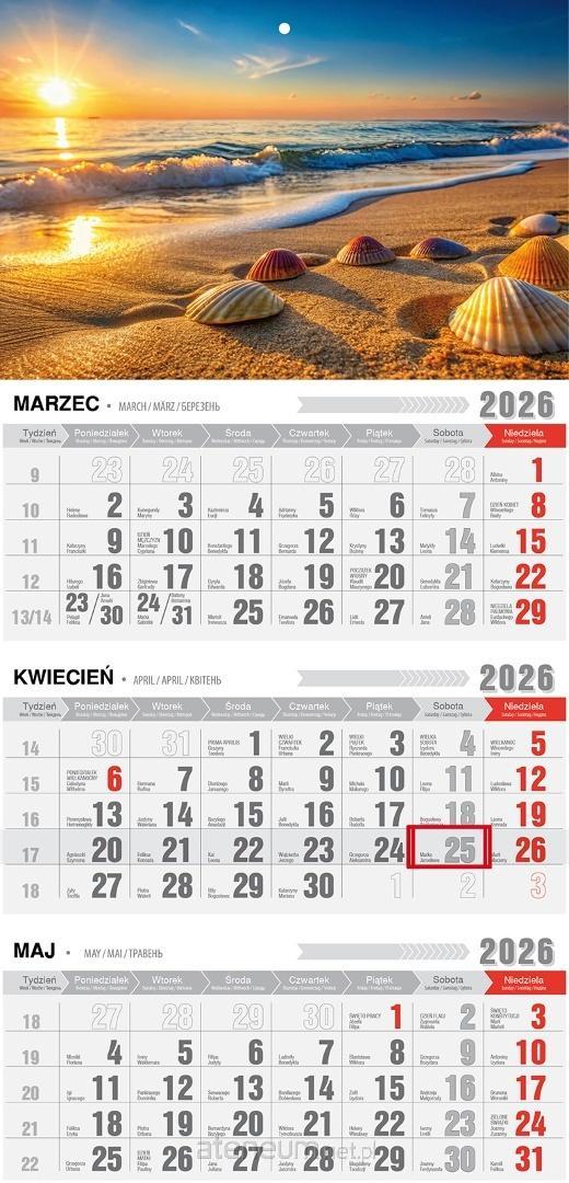 Kalendarz 2026 Trójdzielny Ekonomiczny JEDNOPLANSZOWY z przesuwnym okienkiem. Format 300/623mm. Główka z otworem wierconym . Dodatkowo nazwy miesiąca i dni tygodnia w języku Ukraińskim, Angielskim i Niemieckim. Kalendarium dodatkowo zawiera fazy księżyca i znaki zodiaku. Dużo miejsca do notowania, czytelne duże litery i cyfry. 12 kart do zrywania.