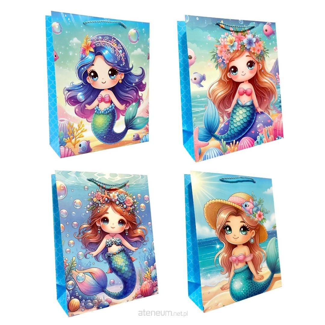 Torebka papierowa dziecięca z wizerunkiem syrenek wykonana z grubszego papieru o gramaturze 210 g, co zapewnia jej większą trwałość i odporność na obciążenie. Wyposażona w grubszy, kolorowy sznurek, który zapewnia wygodny uchwyt i estetyczne wykończenie. To praktyczne opakowanie, które podkreśla wartość wręczanego prezentu.