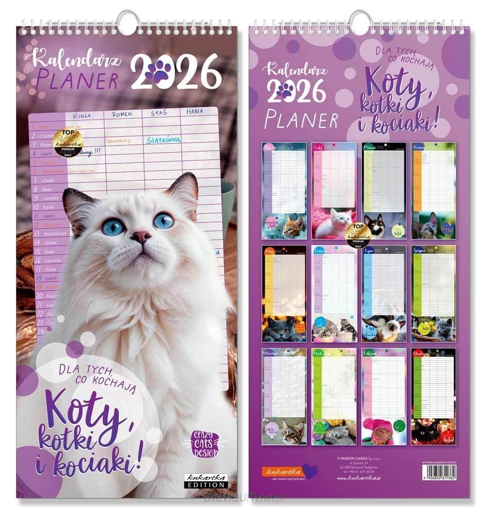 Planer 2026 Koty, kotki i kociaki Podłużny kalendarz ścienny na rok 2026 z najpiękniejszymi kotkami. Każdy miesiąc cieszy pieknym zdjęciem kotka, która będzie wspaniałą ozdobą Waszego domu. Planer KOTY pozwoli być na bieżąco ze wszystkimi zajęciami każdego członka rodziny (podział na 4 osoby) - wszystkie treningi piłkarskie, zajęcia językowe, urodziny, wspólne wyjazdy - nic Cię już nie zaskoczy :) Taki kalendarz to idealny prezent dla miłośników kotów Specyfikacje: Wielkość: 21 x 45 cm Kalendarium: można po nim pisać Styl: cytaty, nowoczesny, klasyczny, zdjęciowy