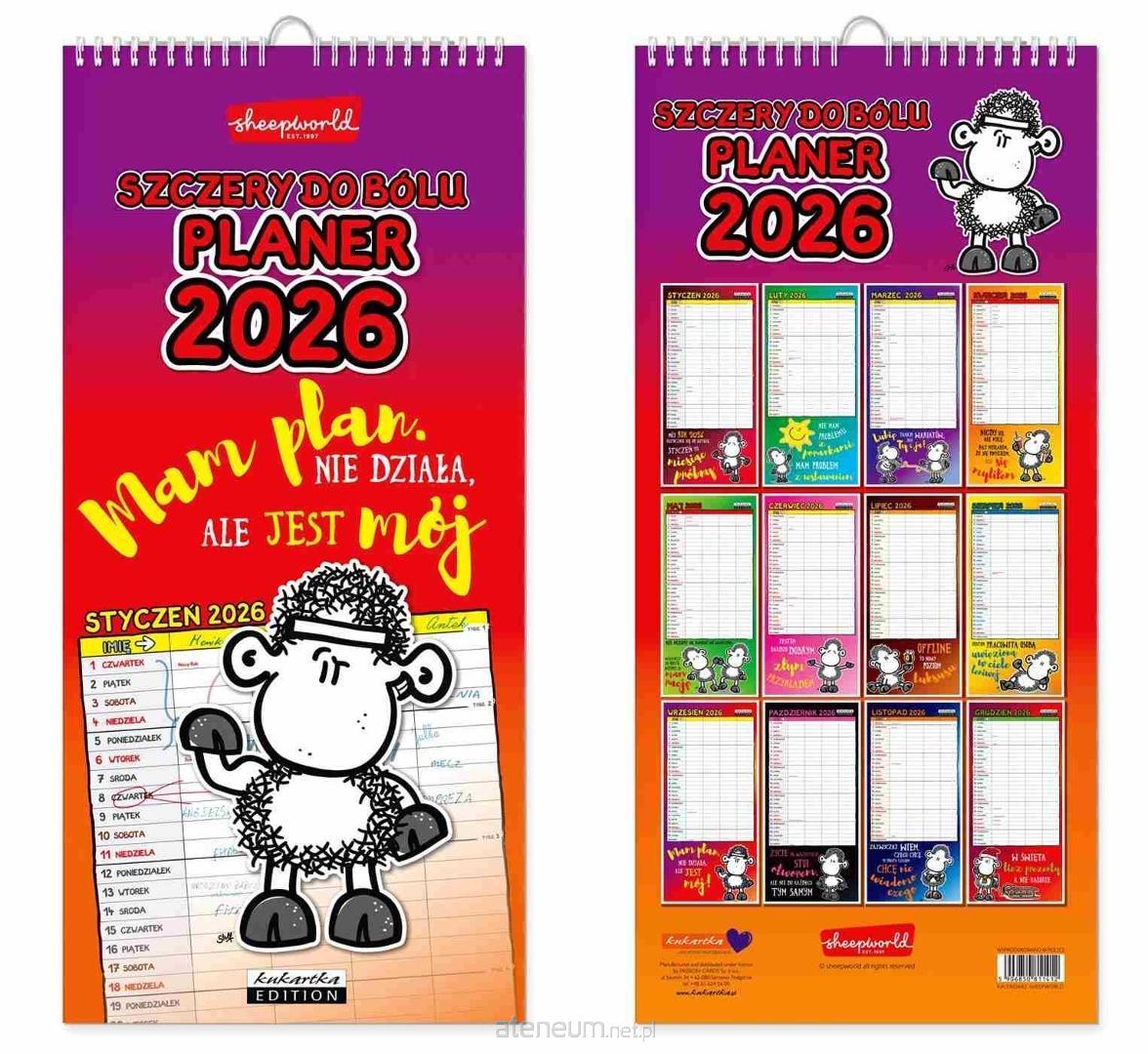 Planer 2026 Sheepworld Podłużny kalendarz ścienny na rok 2026 z serii Sheepworld Każdy miesiąc cieszy wesołą ilustracją owieczki i śmiesznymi cytatami, które będą wspaniałą ozdobą Waszego domu. Planer pozwoli być na bieżąco ze wszystkimi zajęciami każdego członka rodziny (podział na 4 osoby) - wszystkie treningi piłkarskie, zajęcia językowe, urodziny, wspólne wyjazdy itp. - nic Cię już nie zaskoczy :) Specyfikacje: Wielkość: 21 x 45 cm Kalendarium: można po nim pisać Styl: cytaty, nowoczesny, klasyczny, ilustrowany