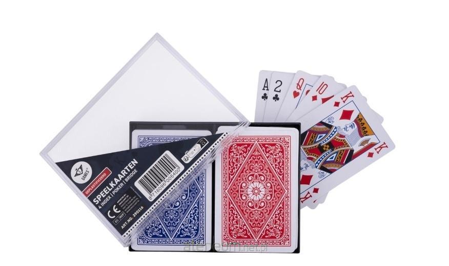 Komplet dwóch talii kart z indeksem w każdym narożniku karty. Całość zapakowana w eleganckie etui. Idealny komplet na prezent dla każdego gracza!