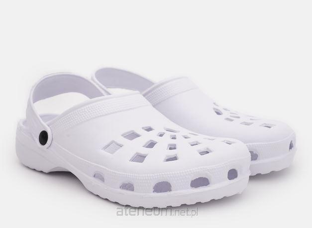 Clogi w kolorze białym. Clogi wykonano z bardzo miękkiego i lekkiego materiału, a zarazem trwałego. Są proste w czyszczeniu, a ich materiał nie wchłania wody, dzięki czemu szybko schną. Clogi wsuwane z dodatkowym ruchomym paskiem który zabezpiecza nogę przed wypadaniem.