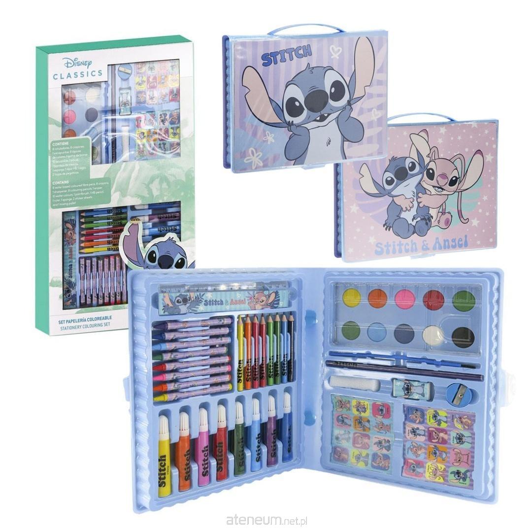 Zestaw zawiera wszystko, czego dziecko potrzebuje do malowania, rysowania i tworzenia własnych dzieł: 10 farb akwarelowych z pędzlem, ołówek, gumkę, gąbkę do malowania, zastrugaczkę, linijkę, dwa zestawy naklejek, 8 pisaków, 8 świecówek, 8 kredek oraz paletkę do mieszania kolorów farbek. Każdy element ozdobiony jest motywami Stitcha, co wprowadza do zabawy bajkowy i zabawny charakter.