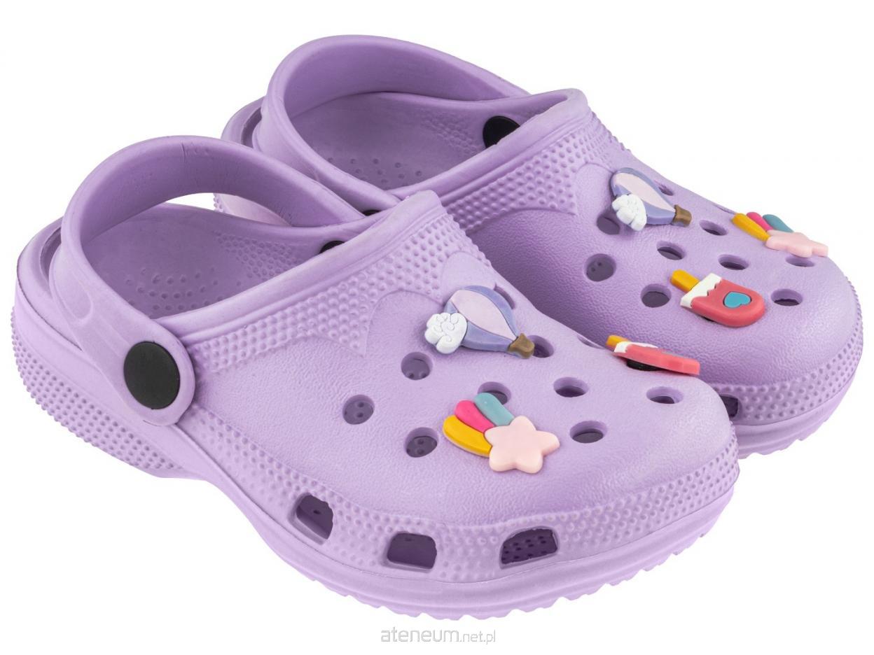 Urocze clogi dziewczęce w kolorze liliowym to idealne obuwie na lato - sprawdzą się zarówno w domu, jak i na zewnątrz, np. w ogrodzie, na plaży czy podczas wakacyjnych wyjazdów. Model został ozdobiony gumowymi pinami w kształcie lodów, balona i spadającej gwiazdki - po trzy na każdego cloga. Piny można dowolnie przekładać i umieszczać w otworach wentylacyjnych, co daje dziecku możliwość personalizacji i zabawy wyglądem obuwia. Clogi wykonane są z miękkiego, lekkiego i elastycznego tworzywa EVA, które zapewnia wysoki komfort noszenia, jest łatwe w czyszczeniu i odporne na wilgoć. Dzięki swojej lekkości buty nie męczą stopy nawet po wielu godzinach noszenia. Dodatkowo model wyposażony został w ruchomy pasek na piętę, który można przełożyć do przodu lub zostawić z tyłu - co pomaga utrzymać stopę we właściwym miejscu i zwiększa stabilność podczas chodzenia. Długość wkładki: 17 cm