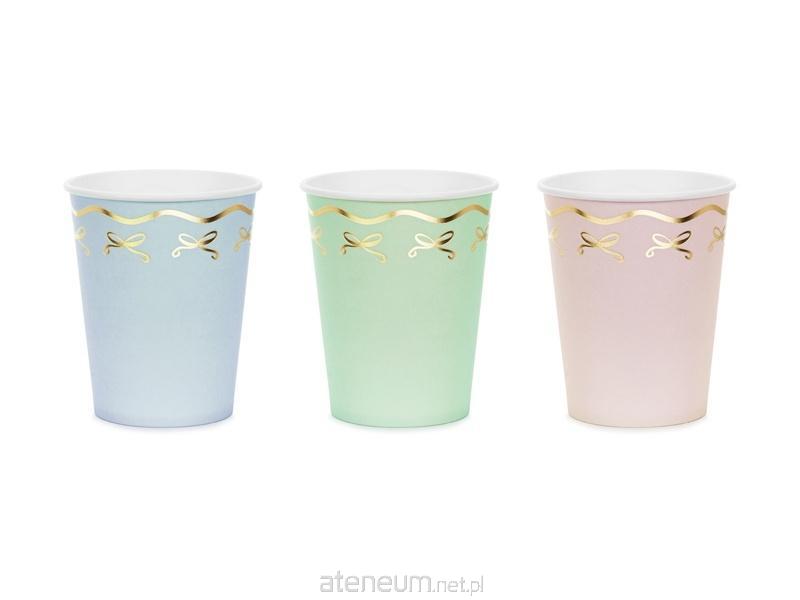 Kubeczki papierowe Kokardki, pakowane po 2 szt. w kolorach: niebieskim, zielonym oraz różowym, pojemność ok. 220 ml (7.4 oz). Produkt jednorazowego użytku. Nie używać do gorących napojów. Kubki na napoje zawierają oznaczenia wymagane przez Rozporządzenie wykonawcze Komisji (UE) 2020/2151 z dnia 17 grudnia 2020 r. dotyczące oznakowania produktów jednorazowego użytku z tworzyw sztucznych. Produkt zawiera etykiety w językach: polskim, niemieckim, czeskim, francuskim, niderlandzkim, słowackim, słoweńskim i bułgarskim.(1 op. / 6 szt.)