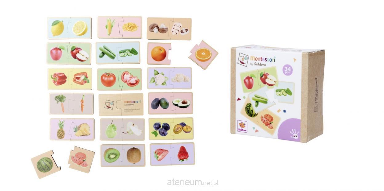 Puzzle z obrazkami owoców i warzyw, 17 wzorów, 34 elementy, 12 x 6 cm, FSC® 100%, sklejka, 2l+