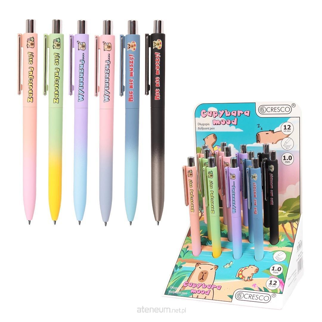 Długopisy KAPIBARA z nadrukowanymi kilkoma ciekawymi hasłami i grafiką to super produkt dla najmłodszych i nie tylko. Pstrykany mechanizm wysuwania wymiennego wkładu. Delikatne softowe wykończenie, ułatwia trzymanie długopisu, a srebrne elementy wykończenia dodają mu ponadczasowej elegancji.
