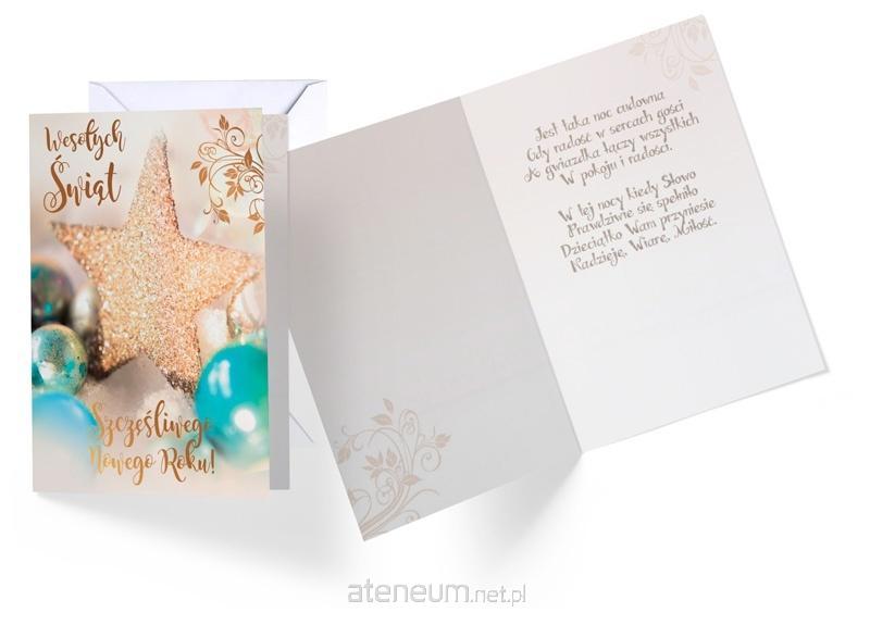 Kartka wielkości B6, zdobiona w zależności od wzoru metaliczną folią lub brokatem. Każda kartka posiada kolorowe życzenia w środku i koperte.