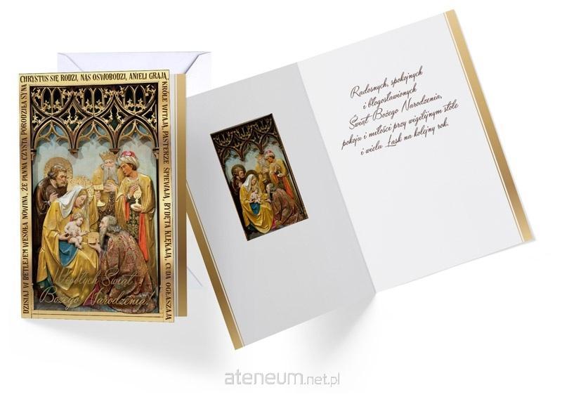 Kartka wielkości B6, zdobiona w zależności od wzoru metaliczną folią lub brokatem. Każda kartka posiada kolorowe życzenia w środku i koperte.